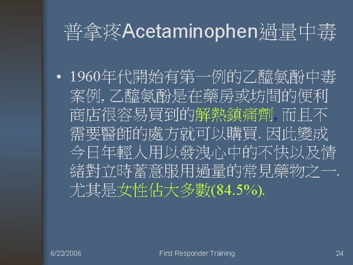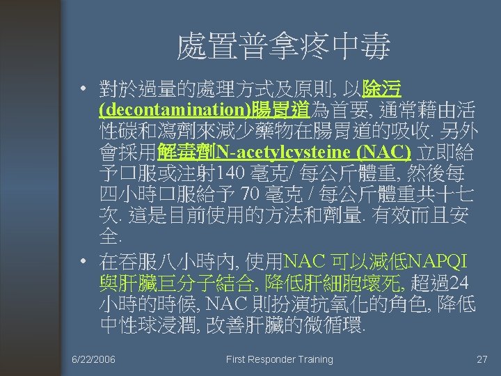 References • Emerg. Med. J. , Mar 2006; 23: 183 - 185. • The American Journal of Emergency Medicine, Volume 14, Issue 5, September 1996, Pages 451 -453 • 蘇昱彰: 乙醯氨酚 (Acetaminophen) 服用過量。Taiwan Medical Journal 2004, Vol 47, No. 9, p. 423— 424. 6/22/2006 First Responder Training 94