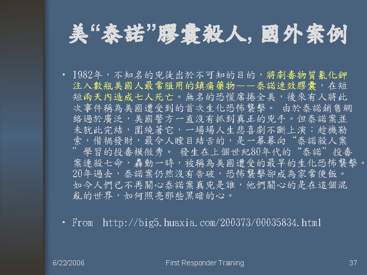 毒蠻牛千面人王進展 被求死刑 • 2005. May. Taiwan台中 6/22/2006 First Responder Training 36