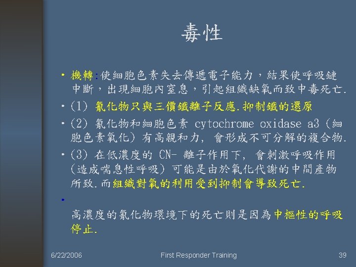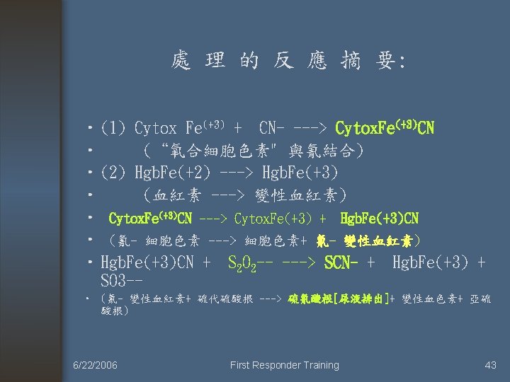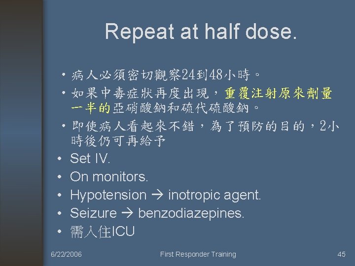 治療方式 • Rate-limiting step: combines CN with sulfur • To form less toxic and water soluble thiocyanate. (SCN-) 6/22/2006 First Responder Training 44
