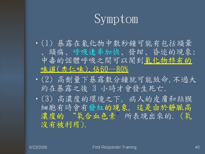Acute cyanide toxicity 6/22/2006 First Responder Training 41