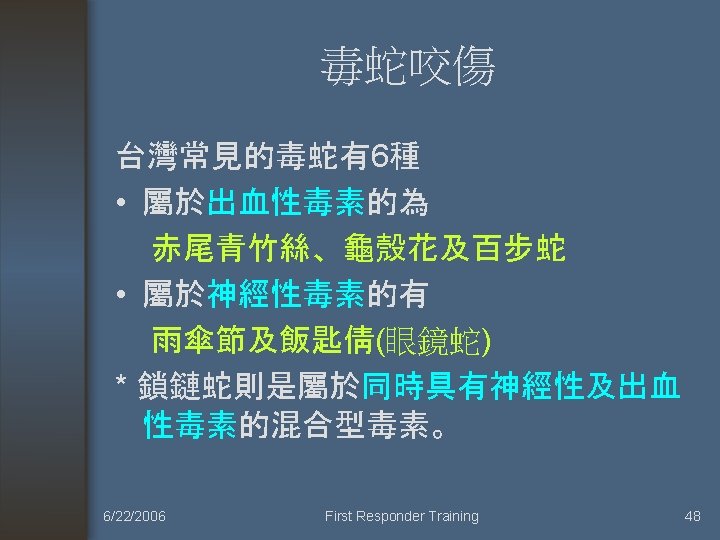 Cyanide antidote package • 12 Amps Amyl nitrite inhalant 12 0. 3 ml/amp • 2 Amps Sodium nitrite inj. 300 mg/10 ml/amp • 2 Amps Sodium thiosulfate inj. 12. 5 g/50 ml/amp * 庫存 1 package. • 大量需要時, 須向台北榮總毒藥物諮詢中心 調. 6/22/2006 First Responder Training 47