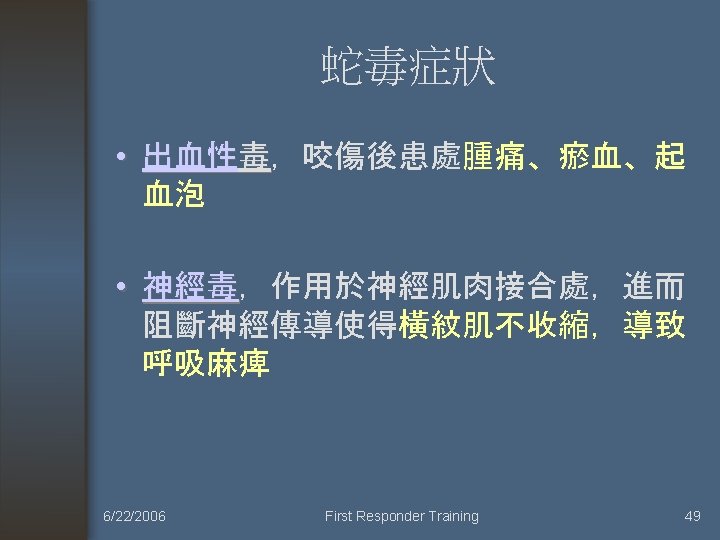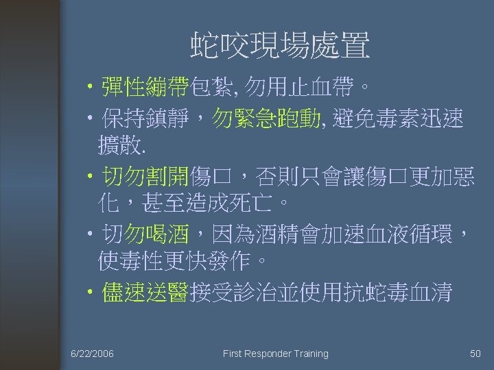 孕婦仍可施打抗蛇毒血清 6/22/2006 First Responder Training 52