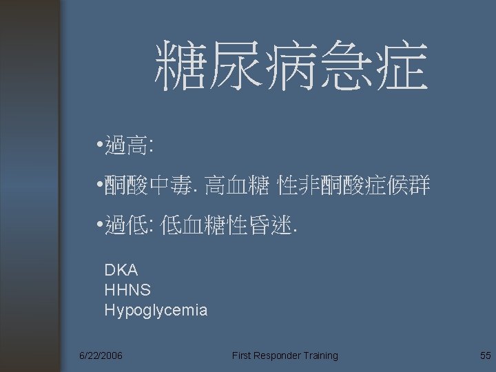 Predisposing factors of DKA • Infection, pancreatitis 感染, 胰臟炎 • Stroke, myocardial infarction, pulmonary embolism • Trauma • Pregnancy • hyperthyroidism • Surgery • Steroid administration. 6/22/2006 First Responder Training 57