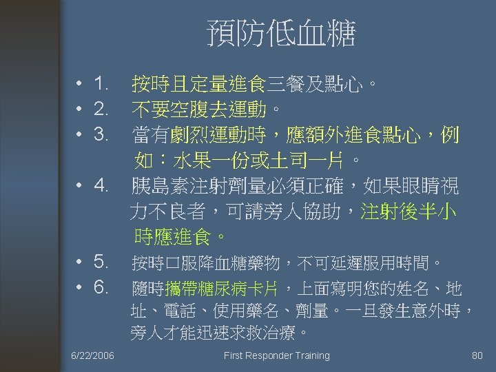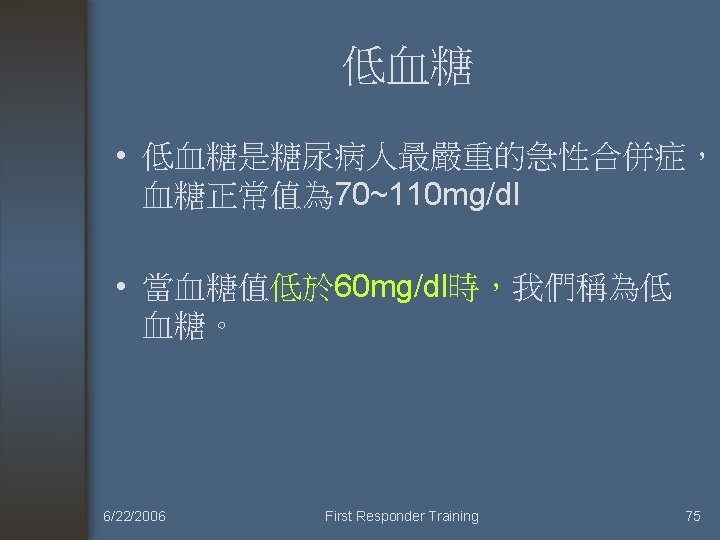 Treatment of HHNS • 1) correction of hypovolemia. 矯正低血容 • 2) treatment of precipitating cause. 治療促發因素 • 3) correction of electrolyte abnormalities. 矯正電解質異常 • 4) correction of hyperglycemia. 矯正高血糖 6/22/2006 First Responder Training 70