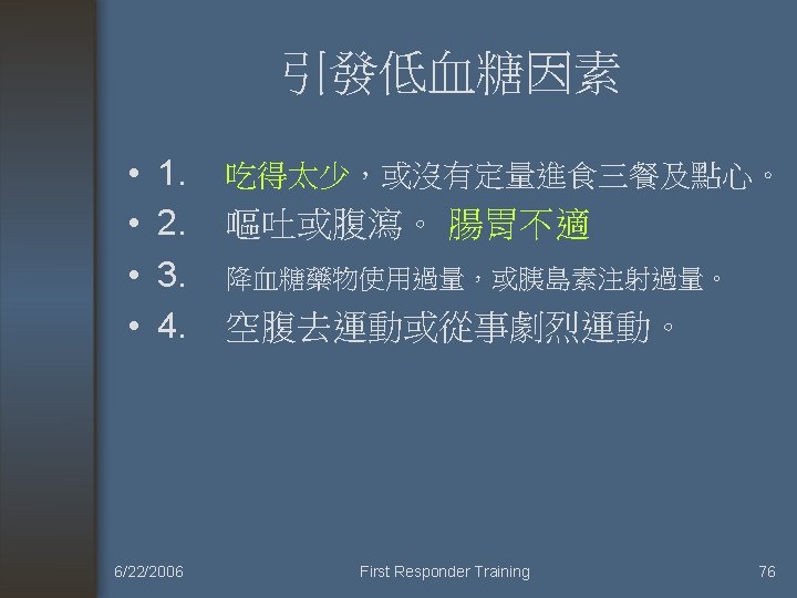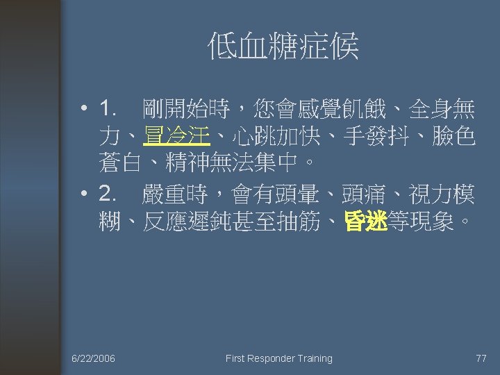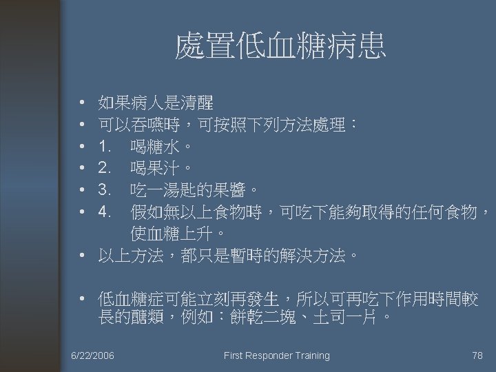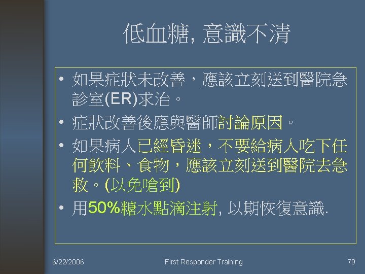 常見內科疾病處 置二 中毒 糖尿病急症 癲癇 6/22/2006 First Responder Training 2