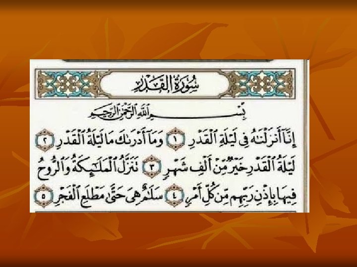 Famous Names of the Qur’an n n n Qur’an: Reading, recitation, collection 2/185, 17/9, it contains the best and most relevant of all previous messages Furqan: Criterion between the right and wrong 25/1, 2/185, 36/2 Tanzil: Revelation, 26/192 Dhikr: Reminder, 15/9 Nur: Light, 4/174 Kitab: Book/scripture, 2/2