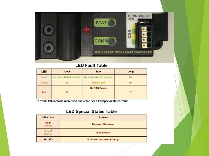 Status Light Quick Reference Radio Not currently implemented Comm Off - No Communication Red Solid - Communication with DS, but no user code Red Blinking - E-stop Green Solid - Good communication with DS Mode Off - Outputs disabled (robot in Disabled, brown-out, etc. ) Amber/Orange - Autonomous Enabled Green - Teleop Enabled Red - Test Enabled RSL See above