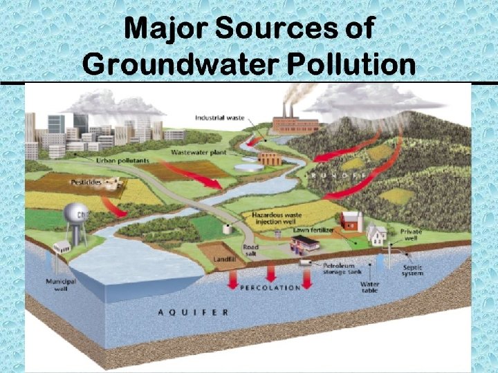 Sources of groundwater pollution • Ground water can become contaminated from natural sources or human activities. • Residential, municipal, commercial, industrial, and agricultural activities can all affect ground water quality. • Contaminants reach ground water from activities on the land surface, such as releases or spills from stored industrial wastes; from sources below the land surface but above the water table, such as septic systems or leaking underground petroleum storage systems.