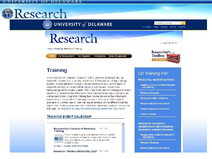 Sample Unallowable Costs • • • Alcoholic Beverages Entertainment Costs Lobbying Goods/Services for Personal Use Losses on Other Sponsored Agreements Fines and Penalties Memberships in Civic/Social Clubs Costs with insufficient documentation Non-travel related Meals and Refreshments (generally not allowable direct costs) http: //www. udel. edu/research/pdf/Allowability-ofmeals. pdf