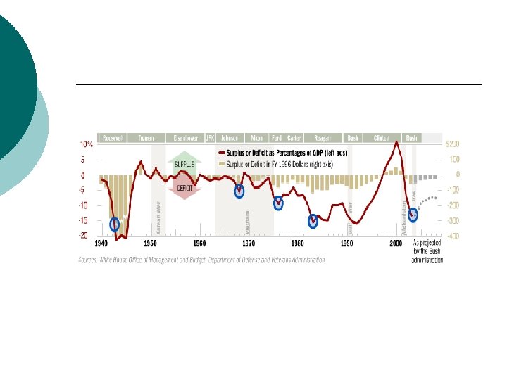 Rationale for Budget Deficits ¡ Large capital projects (highways, etc. ) l ¡ ¡ ¡ The benefits from these project will benefit more than current taxpayers, so deficit financing is appropriate Major Wars Keynesian economics points to the use of deficits to stimulate the economy during periods of economic slowdown Automatic stabilizers tend to increase deficits, since during times of recession, taxes are reduced while unemployment insurance and welfare payments are increased