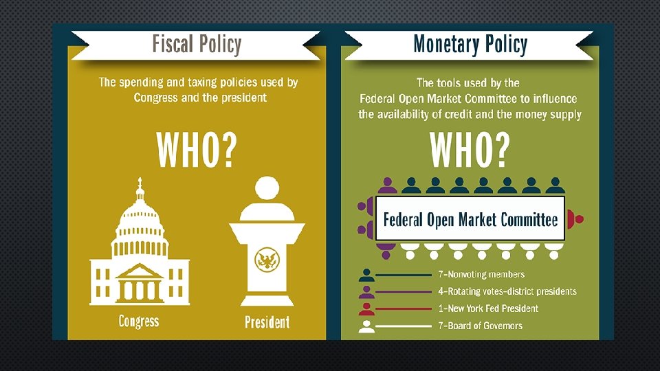 WHAT IS FISCAL POLICY? • FISCAL POLICY REFERS TO THE USE OF THE FEDERAL BUDGET—TAXING, SPENDING AND BORROWING—CAN BE USED TO INFLUENCE THE ECONOMY (I. E. CHANGE THE LEVEL OF TOTAL SPENDING IN THE ECONOMY) • FISCAL POLICY IS SHAPED MOSTLY BY CONGRESS AND THE PRESIDENT • FISCAL POLICY IS INFLUENCED BY POLITICAL IDEOLOGY AND VIEW OF THE APPROPRIATE SCOPE OF GOVERNMENT