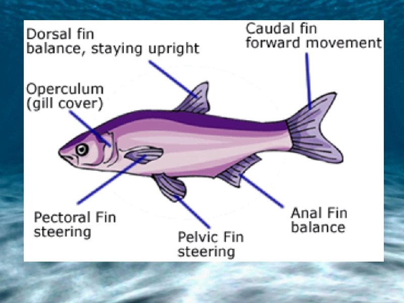 Fish Adaptations • Lateral Line System- used to detect vibrations, orient the fish in water, it is a line of cells running down the side of the fish. • Operculum- gill cover, movement of operculum allows more water to be drawn in. • Swim Bladder- a gas filled sac that helps the fish maintain buoyancy. Sharks don’t have a swim bladder! • Fins- Dorsal, Caudal, Pectoral, Pelvic, Anal.