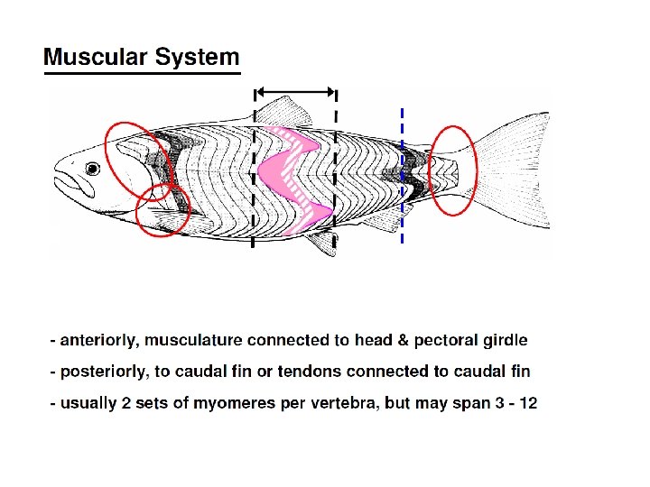 Muscles – White muscle - majority of post cranial muscles in most fishes – Thicker muscle fibers than red muscle (300 m) – Used anaerobically in short-duration burst swimming (fast fibers) » fatigues quickly