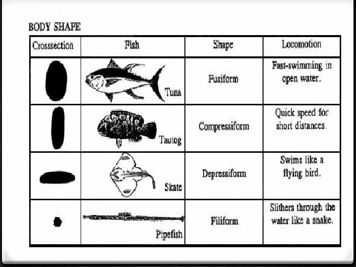 Body Shape 3. oval or fusiform üsection like a salmon or bass are fast swimmers üusually live in open water Largemouth Bass