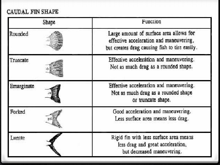 5. Lunate or crescent Øshaped tails like those found on a swordfish Ønot good for maneuvering Øallow for great speed over long distances Øusually found on fish that live in the open ocean.