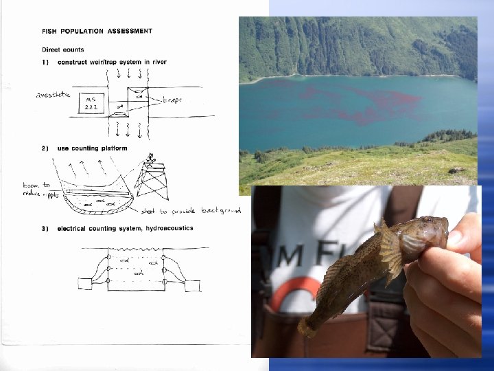 Fish Population Assessment w Estimating population size w 1) Plot method w 2) Mark and recapture (Peterson method) w 3) Mark and recapture (Schnabel method) w 4) Change in ratio or dichotomy method w 5) Removal sampling (Zippin method)