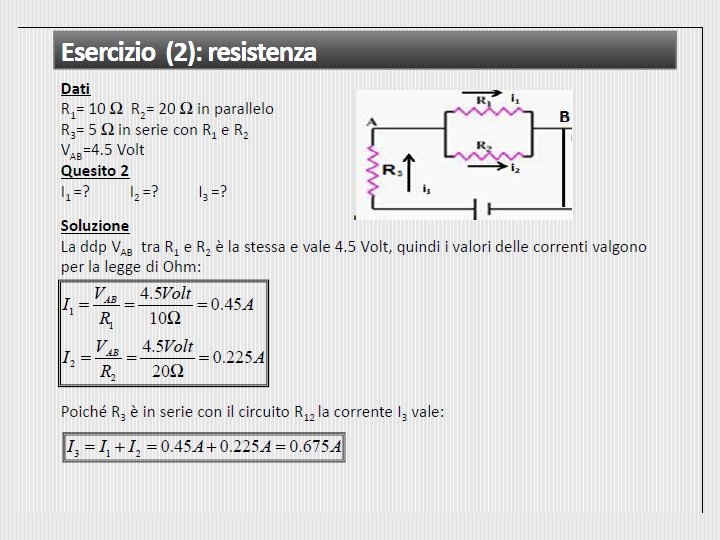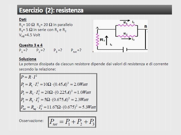 Esercizio (1): resistenze Un circuito elettrico è costituito da due resistenze poste in parallelo tra di loro rispettivamente di 50 e 20 ed a loro volta poste in serie ad una resistenza da 5 . Se la ddp tra i punti A e B del circuito vale 4. 5 V, calcolare: 1) La resistenza equivalente del circuito 2) La corrente che circola in ogni resistore 3) La potenza dissipata da ognuno di essi 4) La potenza dissipata in generale dal circuito