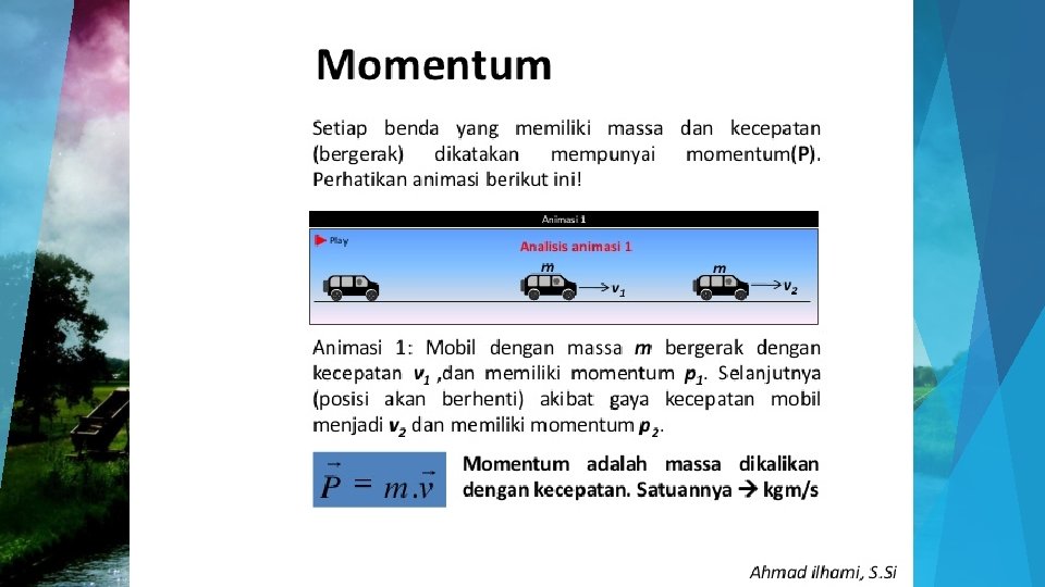 MOMENTUM v Momentum adalah ukuran kesukaran untuk menghentikan suatu benda yang sedang bergerak. v Momentum dilambangkan dengan p di definisikan sebagai hasil kali massa m dan kecepatan v. p= m. v v Momentum merupakan besaran vektor yang memiliki besar dan arah. Arah momentum adalah searah dengan arah kecepatan. Susunan momentum dalam SI adalah kg m s 1.