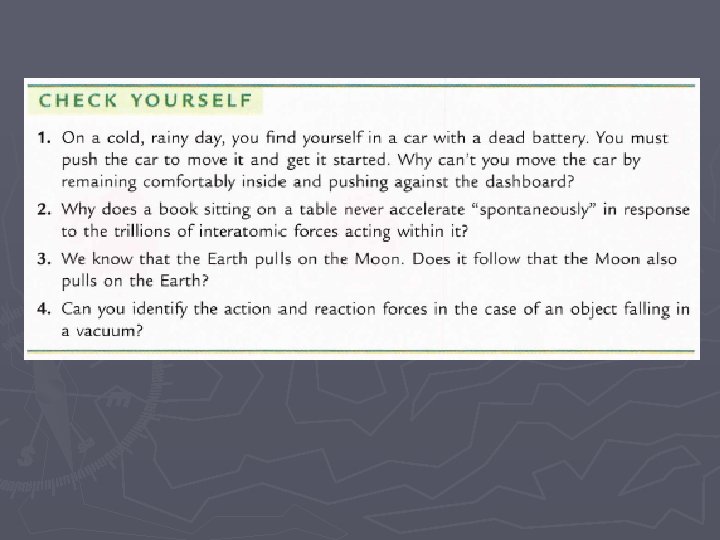 Check Yourself Sebuah mobil melewati belokan dengan tidak mengubah laju. Apakah terdapat gaya netto pada mobil tersebut ketika sedang melewati belokan? a. b. c. d. Tidak—lajunya tetap Ya Bergantung ketajaman belokan dan laju mobil Bergantung pengalaman pengemudi mobil Jawab b Cat : Percepatan muncul karena adanya perubahan laju dan atau arah dari sebuah benda. Jadi, karena arahnya telah berubah, percepatan muncul dan sebuah gaya pasti telah diberikan pada mobil tersebut.