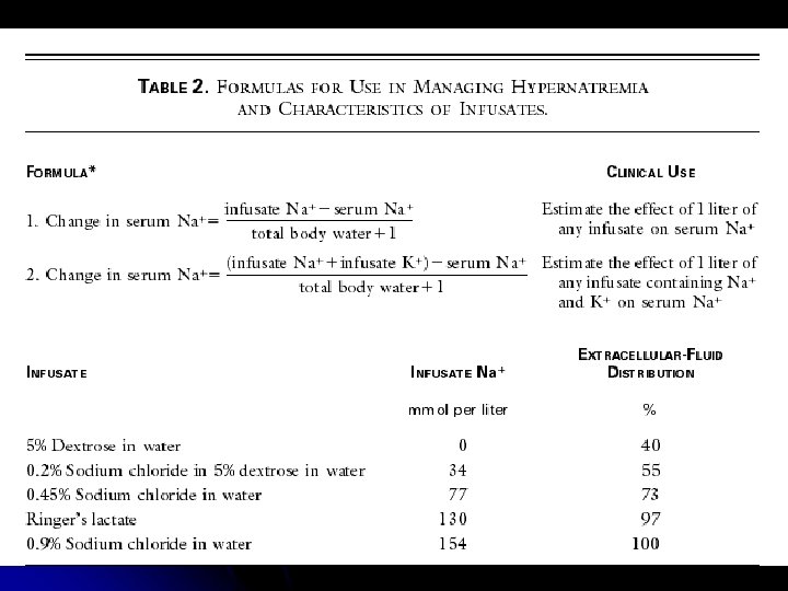 Tratamiento de la hipernatremia complicada. l l Realizar un descenso rápido y pequeño de la natremia 3 a 6 m. Eq/L. l ALR = (Na actual X ACT / Na deseado) - ACT l Suspender la corrección al mejorar el paciente. Reevaluar un descenso < 10 m. Eq/L en 24 hs.