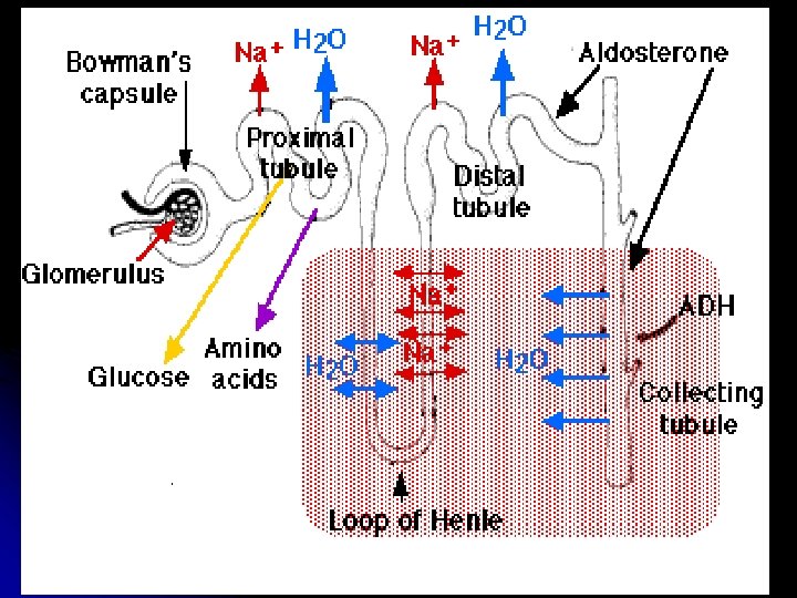 Aumenta la permeabilidad del H 20 a las células principales del túbulo colector: • (+) receptor V 2 --- (+) AMPc ---- migración de vesículas con canales de H 2 O en la membrana apical de la célula (Aquaporina 2) Estos canales aumentan la permeabilidad de la célula, aumentando la absorción. También aumenta la absorción de la urea a nivel del T colector