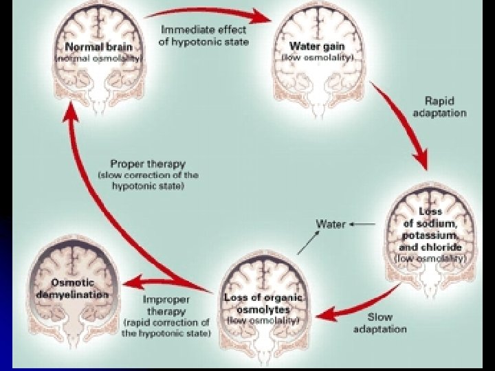 Tratamiento de la encefalopatía hipernatremica consideraciones. l La adaptación es rápida en 4 h. osmoles orgánicos. l La pérdida de los osmoles orgánicos tarda 48 h. l Si la hipernatremia se instala rápido produce daño neurológico. l Los síntomas neurológicos pueden ser consecuencia o causa del trastorno.