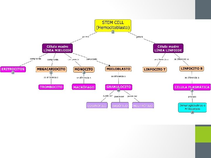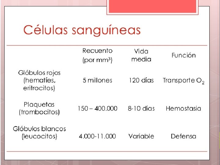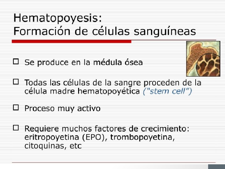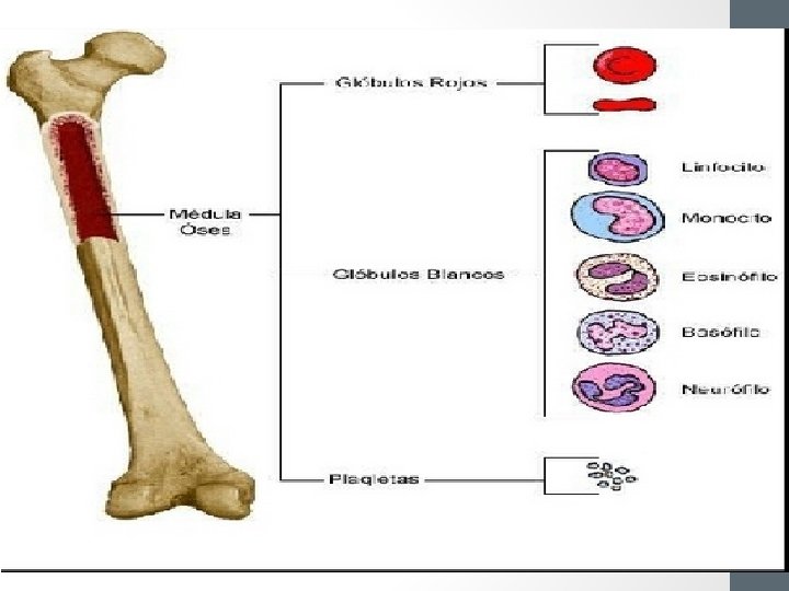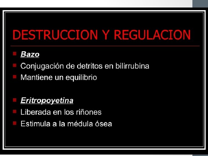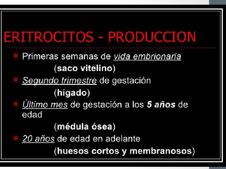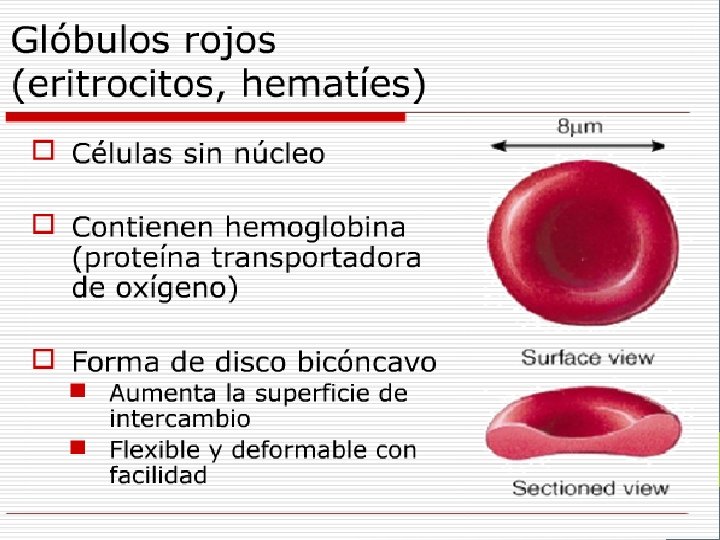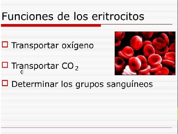Glóbulos rojos (G. R. ) • Posee una proteína ESPECTRINA que le da la capacidad de modificar su forma para pasar por los capilares. • Se producen en la medula ósea roja (eritropoyesis) y se liberan a la sangre en forma inmadura llamada RETICULOCITO, que se maduran en 24 – 36 horas y 105 -120 después envejecen y mueren • En escases de oxigeno, la eritropoyesis es estimulada por la hormona glicoproteína producida por el riñón llamada ERITROPOYETINA