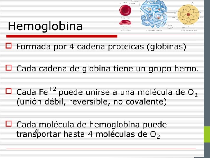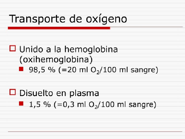 Cantidad de hemoglobina en los eritrocitos • Cada gramo de Hb puede combinar con 1. 39 mililitros de 02 • Varón Puede transportar mas de 21 mililitro de O 2/dl sangre • Mujer Puede transportar 19 mililitros de O 2 / dl