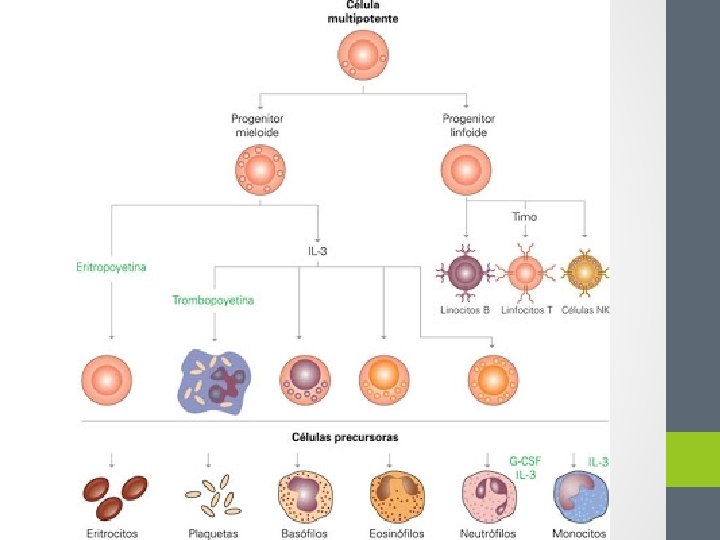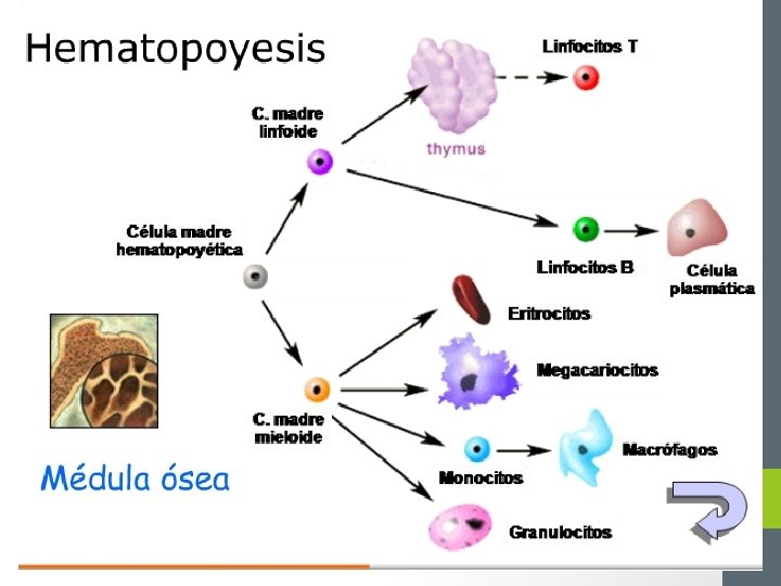 ORÍGEN DE LAS CÉLULAS SANGUÍNEAS (hemato=sangre, poyésis= formación ) TEJIDO HEMATOPOYÉTICO DE LA MÉDULA ÓSEA: Está constituido por células multipotenciales, con gran capacidad de multiplicación y de diferenciación en distintas familias de células sanguíneas; se denominan CÉLULAS MADRE PLURIPOTENCIAL de la médula ósea.