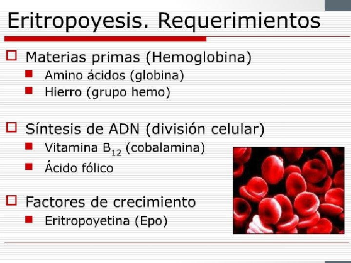 MADURACION DE LOS ERITROCITOS • VITAMINA B 12 (CIANOCOBALMINA) • ACIDO FOLICO • Ambas son necesarias sintesis de ADN maduracion y division nuclear de los GR. • En ausencia GR macrocitos membrana delgada la vida media del GR se acorta a la mitad