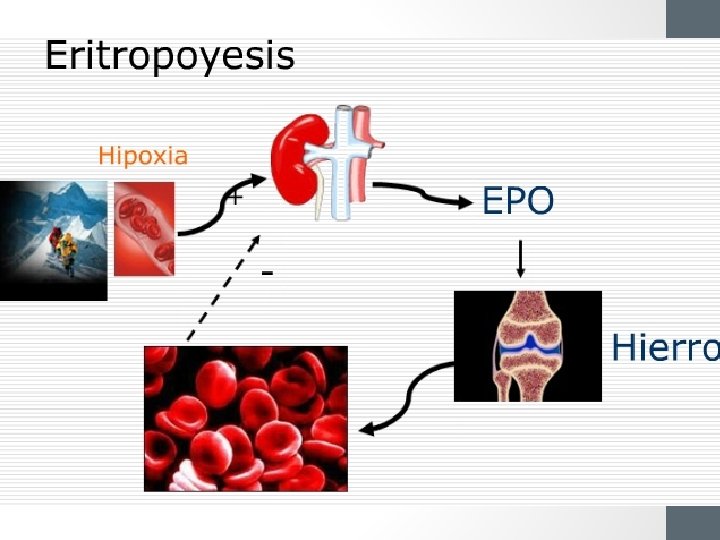 Regulación de la producción de eritrocitos. 2. La eritropoyetina estimula la producción de GR y se forma como respuesta a la hipoxia. Hipoxia producción eritropoyetina formación de GR hasta que desaparezca la hipoxia - Formación de Eritropoyetina 90% de la formación de eritropoyetina. riñón 10% se forma en el hígado - La noradrenalina, la adrenalina y varias prostaglandinas estimulan la producción de eritropoyetina