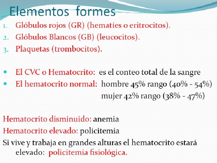 Concentración de Eritrocitos en sangre • En varones sanos: 5. 200. 000 mm 3 ( 300. 000) • En mujeres sanas: 4. 700. 000 mm 3 LAS PERSONAS QUE VIVEN EN ZONAS DE GRAN ALTITUD PRESENTAN UN NUMERO MAYOR DE ERITROCITOS