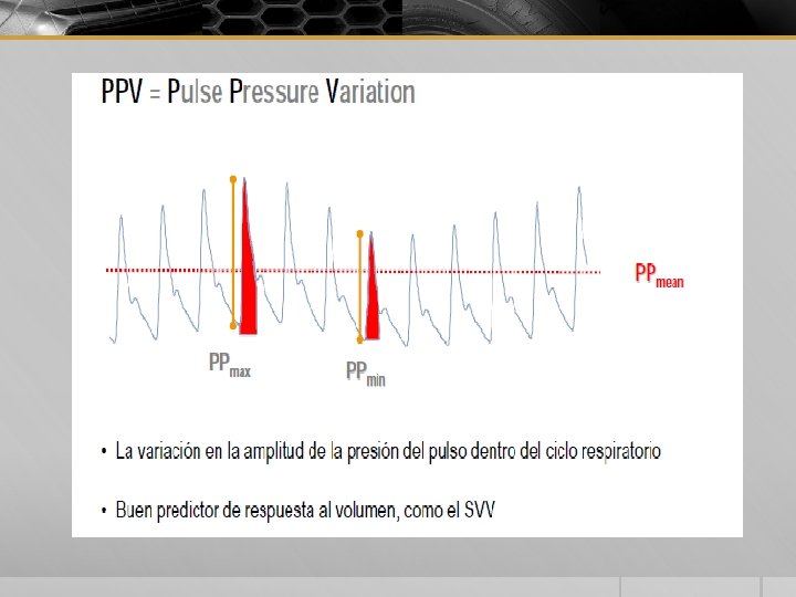 VARIACION PRESION PULSO § INDICADOR INDIRECTO MAS CONUNDENTE Y SENSIBLE DEL ESTADO DE VOLUMEN § PP MAX = PSMAX- PDMAX § > 13% § S 85% PACIENTE SE BENEFICIARA CON FLUIDOS AUMENTANDO EL VOL SISTOLICO § VPP 94% VPN 96% § PP MIN = PSMIN – PD MIN
