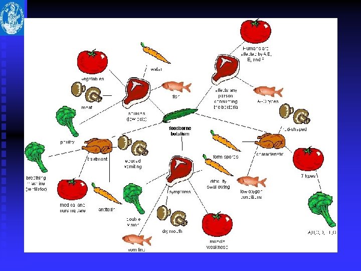 Botulismo: eziologia n n n Clostridium botulinum è un microrganismo gram-positivo, anaerobio obbligato, produttore di spore. È ampiamente distribuito in natura e si ritrova frequentemente nel suolo, in ambienti marini e in prodotti dell’agricoltura Ogni ceppo è in grado di produrre una delle otto tossine antigenicamente distinte (A-H). La malattia umana è causata dalle tossine A, B, E; più raramente dalle tossine F e G.