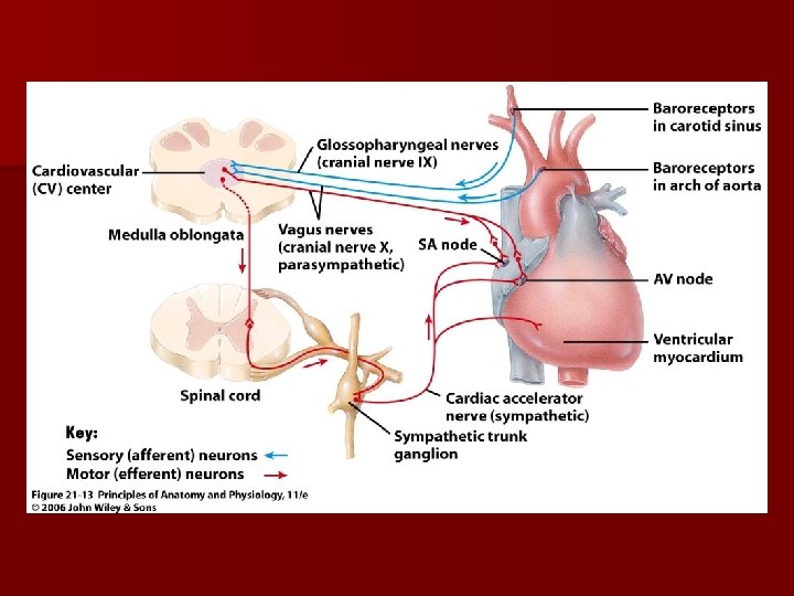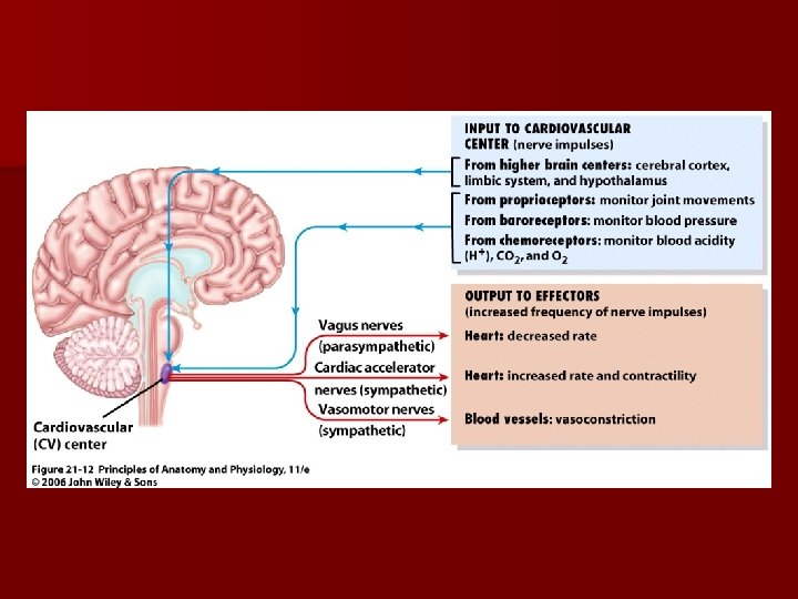 REGULACION DE LA PRESION ARTERIAL n Centro cardiovascular (bulbo y protuberancia) n Receptores sensoriales (aferencias): – Propiorreceptores – Barorreceptores – Quimiorreceptores n Señales eferentes – Simpático (nervios cardíacos y vasomotores) – Parasimpático (n. vago)