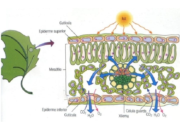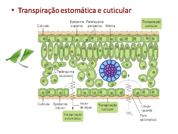 Fisiologia Vegetal Transpiração → Transpiração é o processo em que as plantas perdem água sob forma de vapor. A folha é o principal órgão responsável pela transpiração vegetal; mas outros órgãos como flor, caule e fruto também transpiram. A transpiração total das plantas é realizada pelos estômatos (processo fisiológico) e pela cutícula (fenômeno físico). § Toda água absorvida por uma planta é perdida na forma de vapor. § Esta liberação de vapor d’água chamada de transpiração. § Este fenômeno é de fundamental importância para o transporte da seiva (bruta) nos vasos lenhosos.