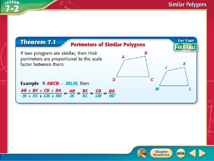 Five-Minute Check (over Lesson 7– 1) Then/Now New Vocabulary Key Concept: Similar Polygons Example 1: Use a Similarity Statement Example 2: Real-World Example: Identify Similar Polygons Example 3: Use Similar Figures to Find Missing Measures Theorem 7. 1: Perimeter of Similar Polygons Example 4: Use a Scale Factor to Find Perimeter
