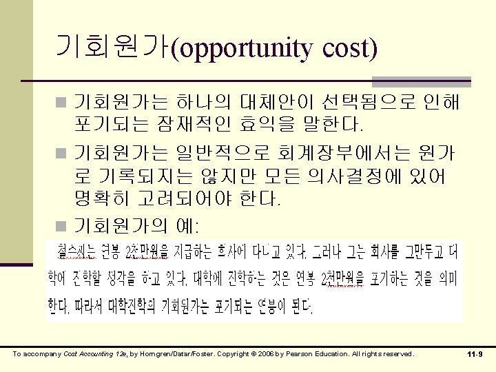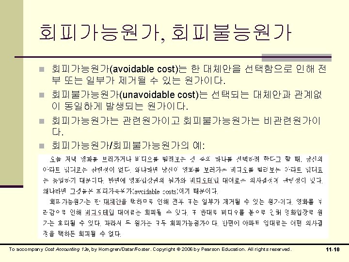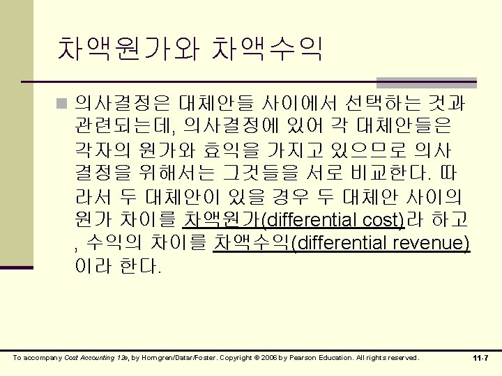 매몰원가 n 매몰원가(sunk cost)- 과거에 이미 발생했으므 로 어떤 의사결정이 내려진다고 해도 회피될 수 없는 원가 역사적 원가(historical cost) n 기발생원가 n 장부가액 n 메몰원가의 예: n To accompany Cost Accounting 12 e, by Horngren/Datar/Foster. Copyright © 2006 by Pearson Education. All rights reserved. 11 -6