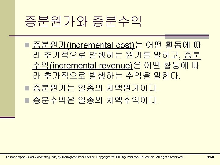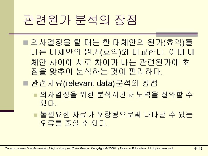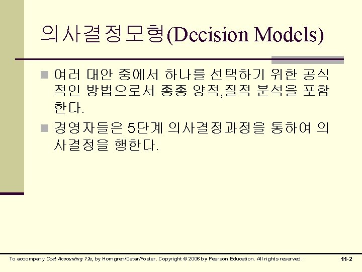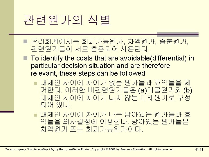 의사결정을 위한 원가분류 n 관련원가(relevant cost) n 매몰원가(sunk cost) n 차액원가(differential cost) n 증분원가(incremential cost) n 기회원가(opportunity cost) n 회피가능원가(avoidable cost) To accompany Cost Accounting 12 e, by Horngren/Datar/Foster. Copyright © 2006 by Pearson Education. All rights reserved. 11 -4
