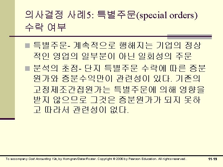 의사결정 사례5: 특별주문(special orders) 수락 여부 To accompany Cost Accounting 12 e, by Horngren/Datar/Foster. Copyright © 2006 by Pearson Education. All rights reserved. 11 -20
