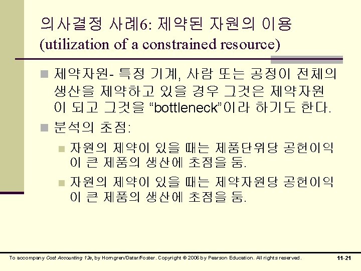 의사결정 사례6: 제약된 자원의 이용 (utilization of a constrained resource) To accompany Cost Accounting 12 e, by Horngren/Datar/Foster. Copyright © 2006 by Pearson Education. All rights reserved. 11 -22