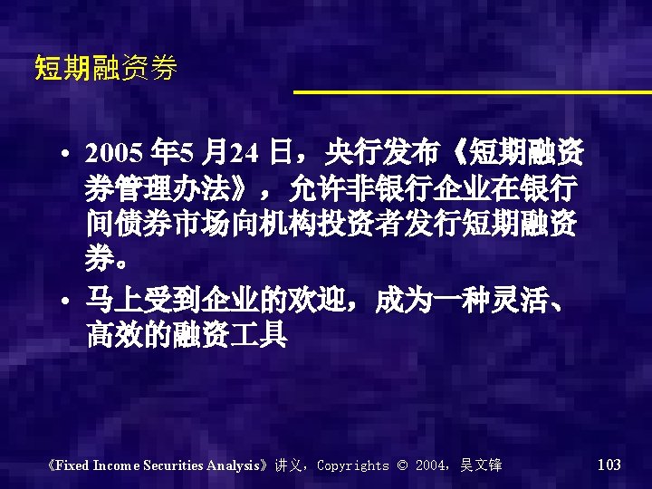 总发行 中国企业债发行量 日 期 间 额(亿元 隔 ) 总发行 期数 计息方 式 _固 定利率( 亿元) 计息方 式 _浮 动利率( 亿元) 期 限 ≤ 1年 ( 亿元) 1年 <期 限 ≤ 3 年(亿元 ) 3年 <期 限 ≤ 7 年(亿元 ) 7年 <期 限(亿元 ) 2005 1605 94 522 50 1101 0 30 474 2004 307 18 134. 8 172. 2 0 0 14 293 2003 458 20 418 40 0 8 0 450 2002 370 17 370 0 0 25 50 295 2001 175 6 105 70 0 0 25 150 2000 70 3 40 30 0 20 20 30 1999 87. 5 11 87. 5 0 0 15 17 55. 5 1998 73. 39 5 73. 39 0 0 41. 39 32 0 1997 45 3 45 0 0 30 15 0 1996 8 1 8 0 0 1995 0. 3 1 0. 3 0 0 1992 0. 3 1 0. 3 0 0 《Fixed Income Securities Analysis》讲义,Copyrights © 2004,吴文锋 102