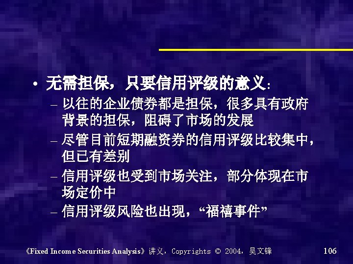 企业债券 • 1983年开始发行 • 但非常不发达,发行量很小 《Fixed Income Securities Analysis》讲义,Copyrights © 2004,吴文锋 101