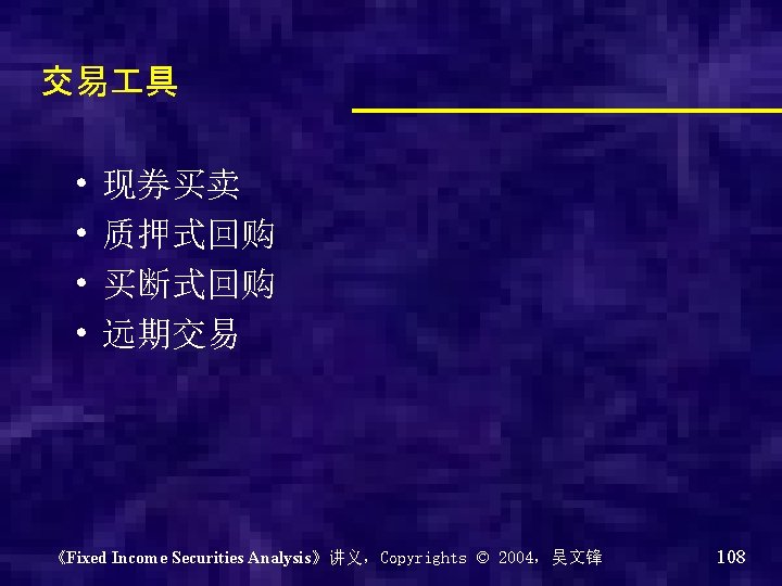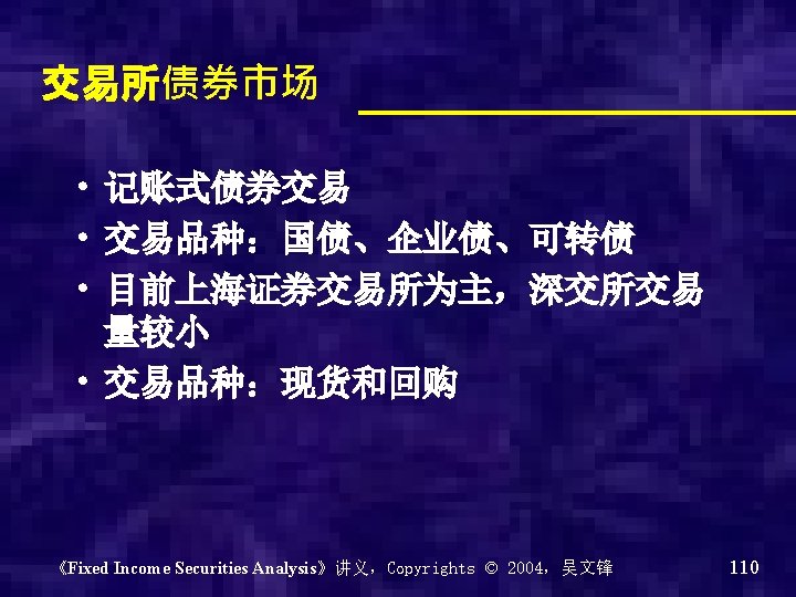 回购(Repurchase ) • Usually called repo • Dealer sells securities • Dealer temporarily borrows money • Dealer repurchases the securities at a later date at a higher price • 小问题: – 质押式回购与买断式回购的区别? 《Fixed Income Securities Analysis》讲义,Copyrights © 2004,吴文锋 109