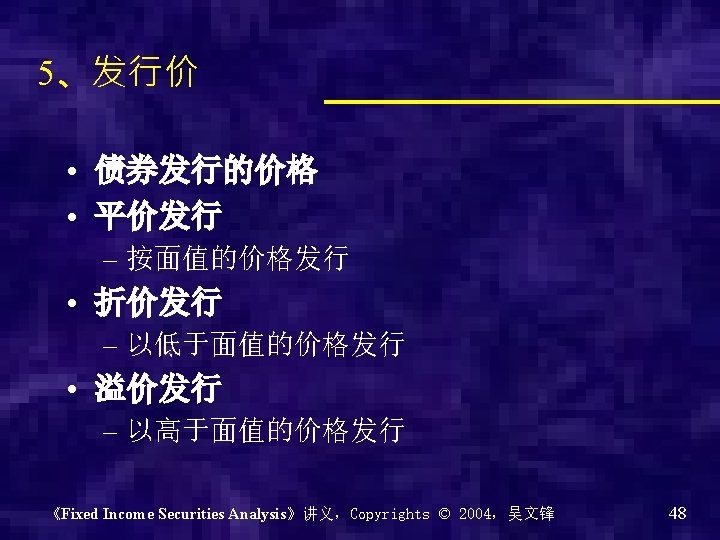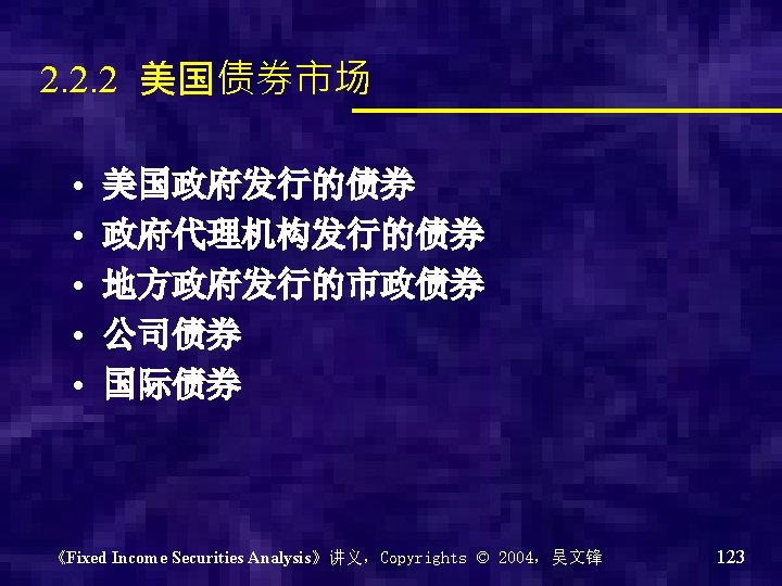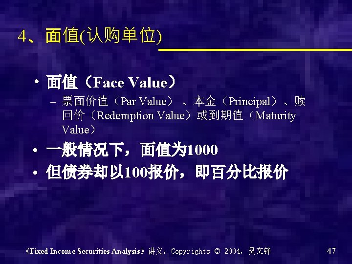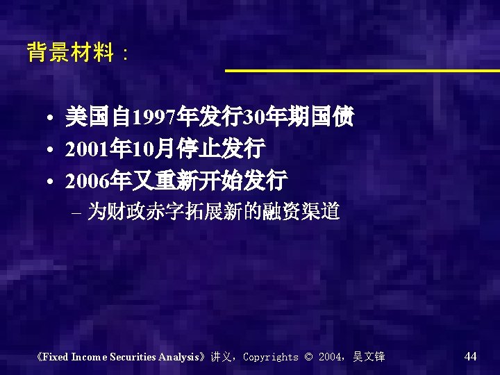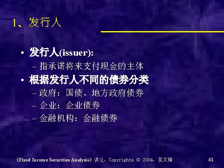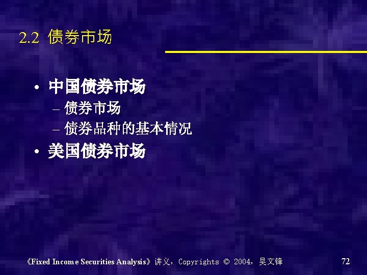 Fixed Income Securities Analysis 固定收益证券分析 吴文锋 上海交通大学安泰经济与管理学院 《Fixed Income Securities Analysis》讲义,Copyrights © 2004,吴文锋 1