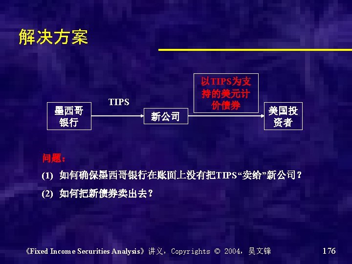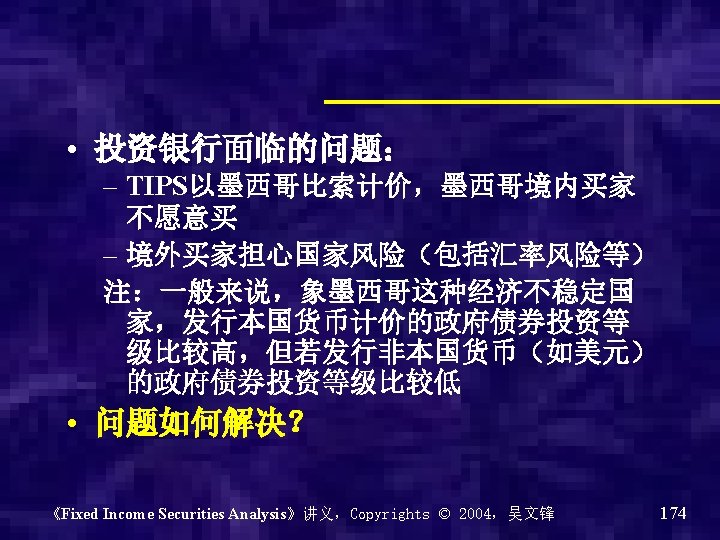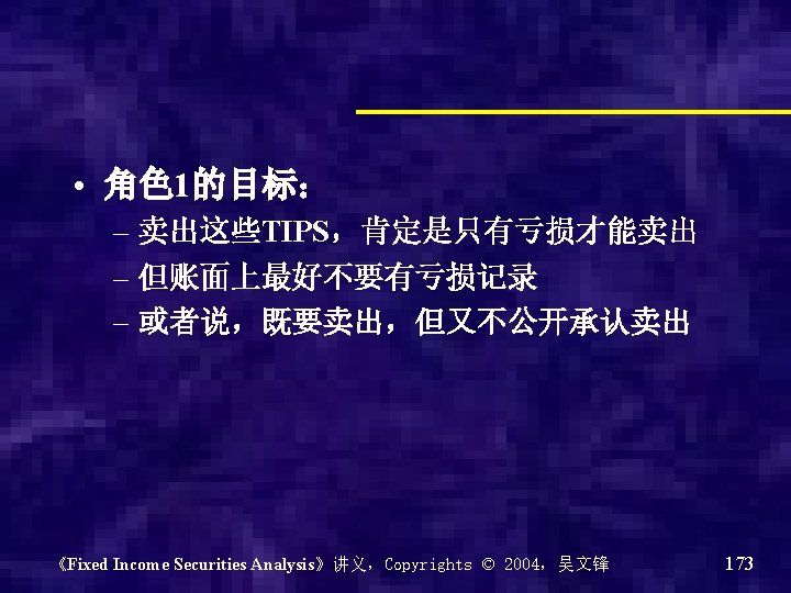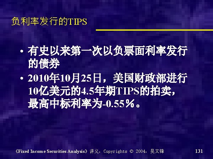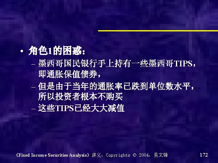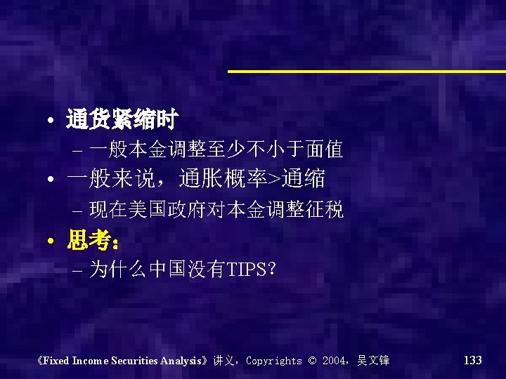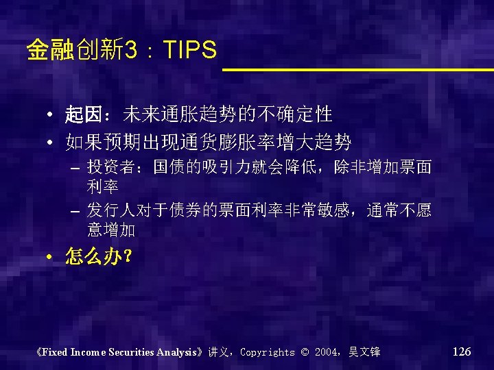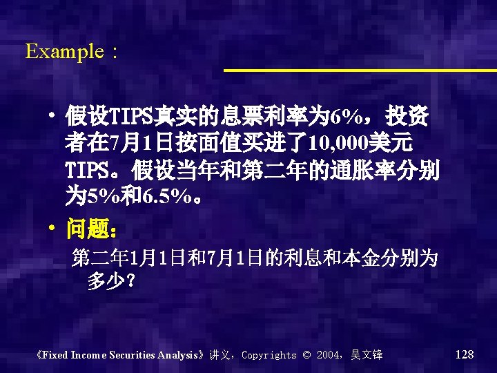 • Treasury Inflation protected securities (TIPS):通胀保值国债 – Coupon rate is fixed – Real rate of return – Inflation adjusted principal,根据通胀率半 年调整一次本金 《Fixed Income Securities Analysis》讲义,Copyrights © 2004,吴文锋 127