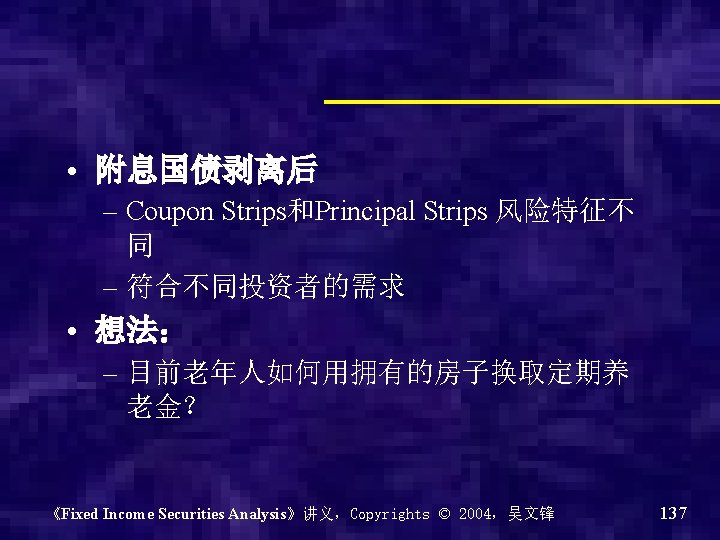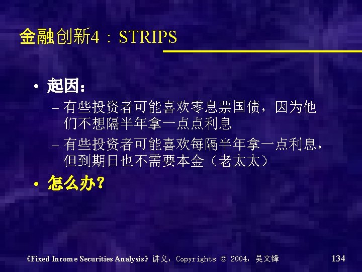 Strips • Separate Trading of Registered Interest and Principal of Securities,本息剥离证券 • A type of zero coupon bond created from Treasury notes and bonds • Treasury STRIPS – Coupon strips – Principal strips 《Fixed Income Securities Analysis》讲义,Copyrights © 2004,吴文锋 135