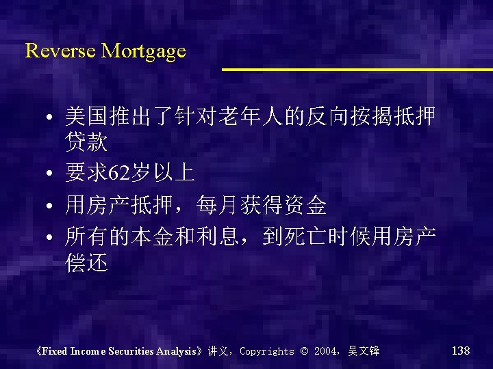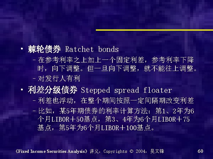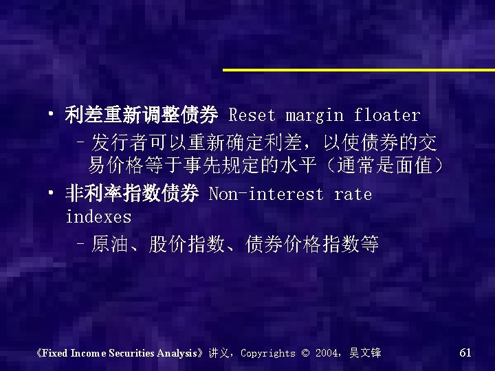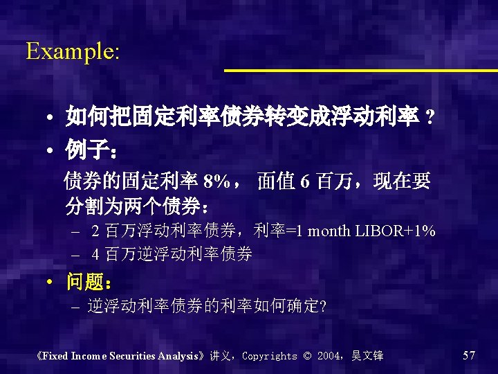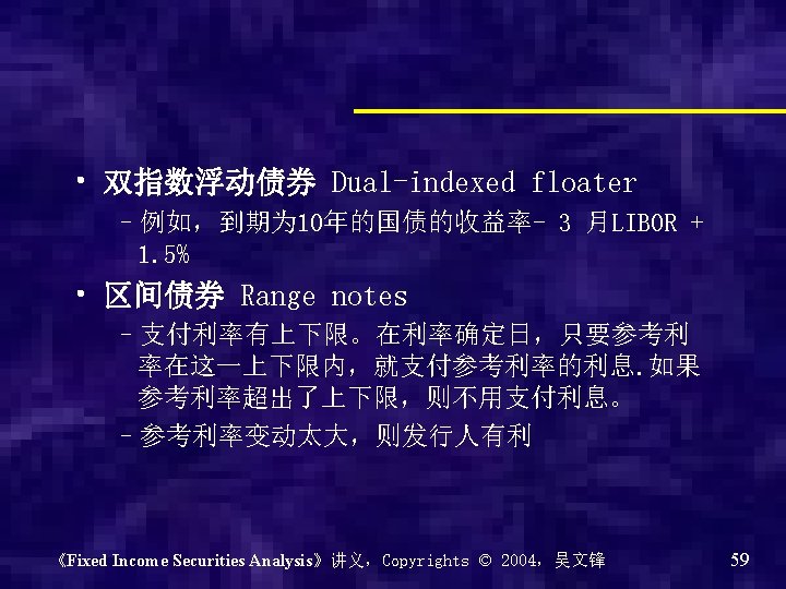 • 练习: 已知逆浮动为 20%-2 LIBOR,那么浮动呢? 《Fixed Income Securities Analysis》讲义,Copyrights © 2004,吴文锋 58