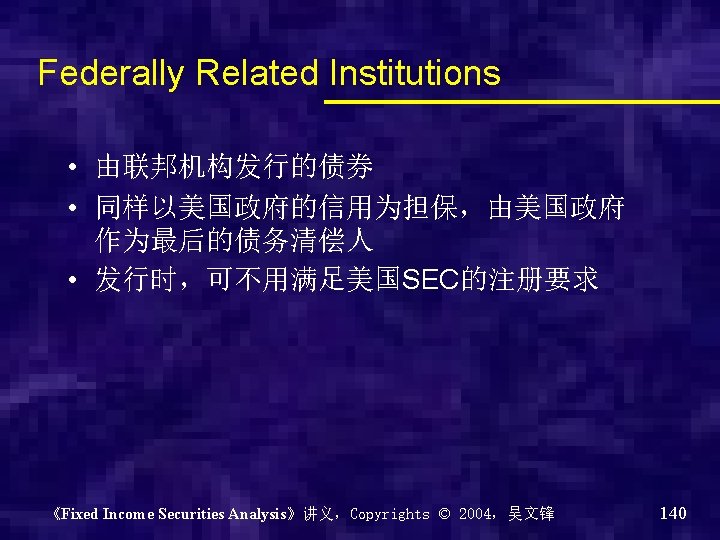Agency Issues • Securities issued by various agencies and organizations of the U. S. government • Very high quality issued • Two types: – Federally related institutions – Government sponsored entities 《Fixed Income Securities Analysis》讲义,Copyrights © 2004,吴文锋 139