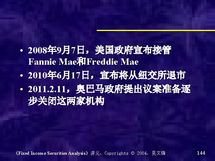 Fannie Mae和Freddie Mae背景材料 • Fannie Mae – 成立于1938,政府机构 – 1968年私有化,股份制公司 • Freddie Mae – 1970年成立 – 国会推动,目的是为了对抗Fannie Mae的 垄断 《Fixed Income Securities Analysis》讲义,Copyrights © 2004,吴文锋 143